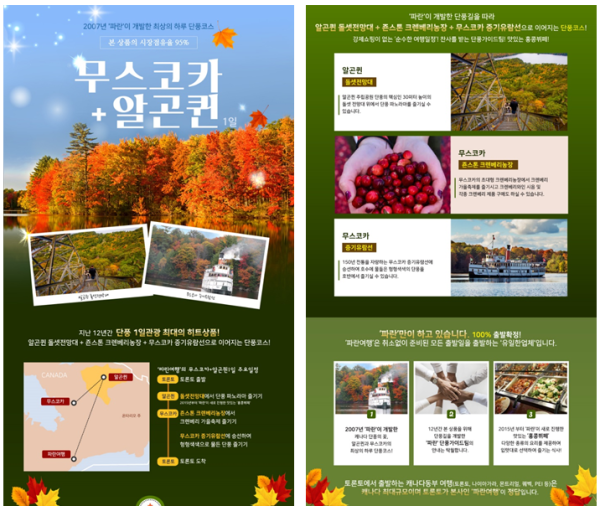 한인회주최 키치너출·도착 가을 단풍여행안녕하십니까? 교민여러분, 3월 정기총회에서 말씀드렸던 우리들만의 가을 단풍 관광 일정이 확정되었습니다. 장소는 알공퀸 주립공원과 무스코카이며 10월 5일 (토요일) 키치너에서 출발(06:30am)하여 다시 키치너로 도착하는 일정입니다. 금액은 일인당 $110 이며 한인회에서 커피, 도너츠 및 각종 다과를 준비할 예정입니다. 우리 한인회에서는 이번 여행을 시발점으로 다른 관광 코스도 시도해 보려고 합니다. 온타리오에서는 최고의 가을 단풍 경치를 자랑하는 알공퀸 주립공원으로 교민 여러분들을 모두 모시면 좋겠습니다. 좌석이 한정되어 있싸오니 관심있는 교문분들께서는 서둘러 예약을 해주시면 감사하겠습니다. 10월 5일(토요일) 오전 6시 30분, 키치너에서 출발하는 가을 단풍 관광버스에서 뵙겠습니다. 예약 및 문의: 회장 장재진 (416-371-6564) 재무 홍순호 (226-606-0137) 2019년 8월 1일 한인회장 장재진 7 STAR CONVENIENCE , 156 ERB ST.WEST, WATERLOO TEL: 519725 9543 매일오후 9시까지 OPEN 하니까 예약.지불해주시면 감사하겠읍니다. 현금 지불만 가능합니다.
