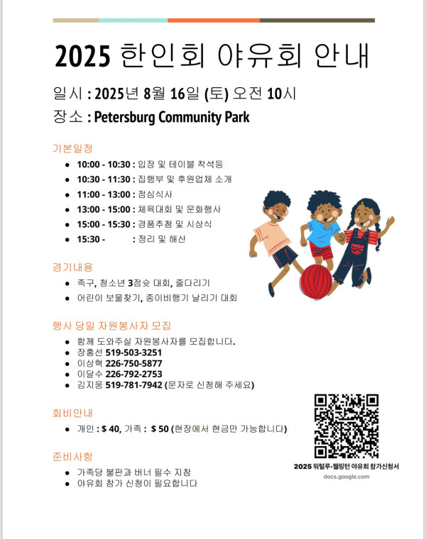 2025 워터루 웰링턴 한인 야유회아래의 포스터를 참조하여 주세요. 야유회 장소 https://maps.app.goo.gl/39LmukFu6qQvTmh89?g_st=akt 입니다 원활한 행사 진행을 위해 참가신청을 해주셔야 합니다. 2025 워털루·웰링턴 야유회 참가신청서 - https://docs.google.com/forms/d/e/1FAIpQLSf9pf42TW13MyB36YTFaKTsMX7YnKlSg2HyEKVn3wtTQW6pSw/viewform