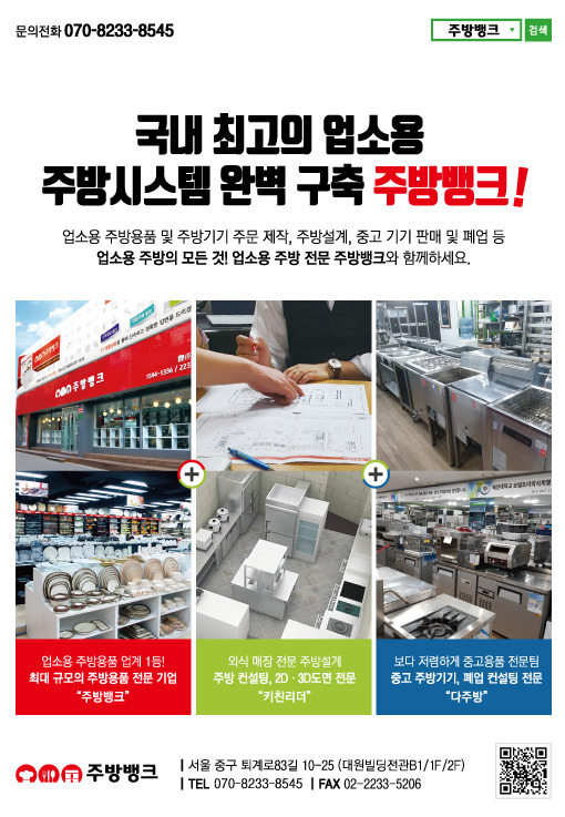 업소용 주방용품,주방설비,주방기기, 업소용 그릇 해외납품 전문 주방뱅크 입니다.![]() 안녕하세요~^^ 황학동 중앙시장에 위치한 업소용 주방용품 전문기업 주방뱅크 입니다. 주방뱅크는 업소용 주방기기/ 주방용품 분야의 선두주자로 외식업 창업에 필요한 5만여가지 주방용품을 취급하며, 주문 제작 및 온.오프라인 판매 등 업소용품만을 전문적으로 취급합니다. 현재 국내 유명 프랜차이즈 200여개 업체와 거래하고 있으며, 국내 최고 수준의 주방용품 정보와 함께 업소용품에 관해 모든 부분을 한곳에서 해결할 수 있는 점도 강점으로 꼽히고 있습니다. >>>주방뱅크는..... (1) 국내 최고 수준의 5만여 주방집기 정보 (2) 전문 컨설런트의 신속하고 친절한 상담 (2) 외식업종 종사자 최다접속!최다방문! (1일 방문객 8,000~12,000명) (3) 관공서/ 학교/ 병원/ 프랜차이즈 최다 납품실적. (4) 1:1 맞춤형 상담에서 견적 - 설계- 제작- 시공까지 한번에 (5) 합리적인 가격, 신속한 A/S를 최우선으로. >>>주방뱅크는 이런 점이 좋습니다. 1] 전문인력 구성 주방뱅크는 업계에서는 드문 충분한 인력구성으로 1년 365일 고객 요청시 신속한 서비스를 제공하기 위해 최선을 다하고 있습니다. 2] 주방설계 및 컨설팅 한번 설치되면 변경이 어려운 주방!!! 메뉴와 업종을 고려 효율성과 능률성,위생적이고 과학적인 설계!!! 현장 경험이 풍부한 실무경력 30년 이상의 주방전문가가 체계적이고 과학적인 주방컨설팅을 제공합니다. 3] 신속 정확한 배송시스템 자체 물류, 검수사업부 운영으로 제품의 파손 염려가 없도록 꼼꼼한 포장 및 배송이 가능합니다. 4] 설치 및 시공 다양한 현장 경험을 가진 주방전문가가 정확하고 신속한 제품 설치 및 시공을 지원하며, 사후 관리를 지속적으로 해드립니다. 5] 국내 최대 온.오프라인을 통한 홍보효과 대형전시장 입구에 유망 프랜차이즈 업체 홍보 코너가 있으며,주방뱅크가 운영하는 쇼핑몰에 광고 및 각종 포털(블로그,까페,SNS)에 홍보해 드립니다. ※ 더욱 자세한 내용은 주방뱅크 쇼핑몰 http://www.jubangbank.co.kr 접속하시거나, 주방뱅크를 검색하세요. 귀사의 사업이 더욱 번창하시기를 기원합니다. 궁금하신 사항이나 문의 사항이 있으시면 언제든지 전화주세요. ============================================================================== (주)주방뱅크 이연숙 상무 / 전략기획사업부 A. 04576 서울 중구 퇴계로83길 10-25 T. 02-2237-1914 F. 02-2233-5206 E. peaceio@nate.com/ Http://www.jubangbank.co.kr
